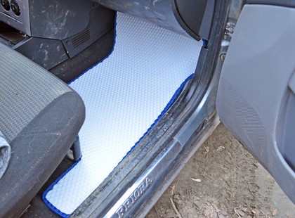 Автоковрики ЕВА не впитывают, а удерживают грязь в ячейках. Вода не катается по полу, как в резиновых половичках, однако, её все равно видно. ЕВА удобны тем, что их легко достать не пролив и вытряхнуть. Они дешевле.