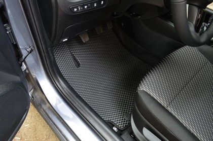 Автоковрики ЕВА не впитывают, а удерживают грязь в ячейках. Вода не катается по полу, как в резиновых половичках, однако, её все равно видно. ЕВА удобны тем, что их легко достать не пролив и вытряхнуть. Они дешевле.